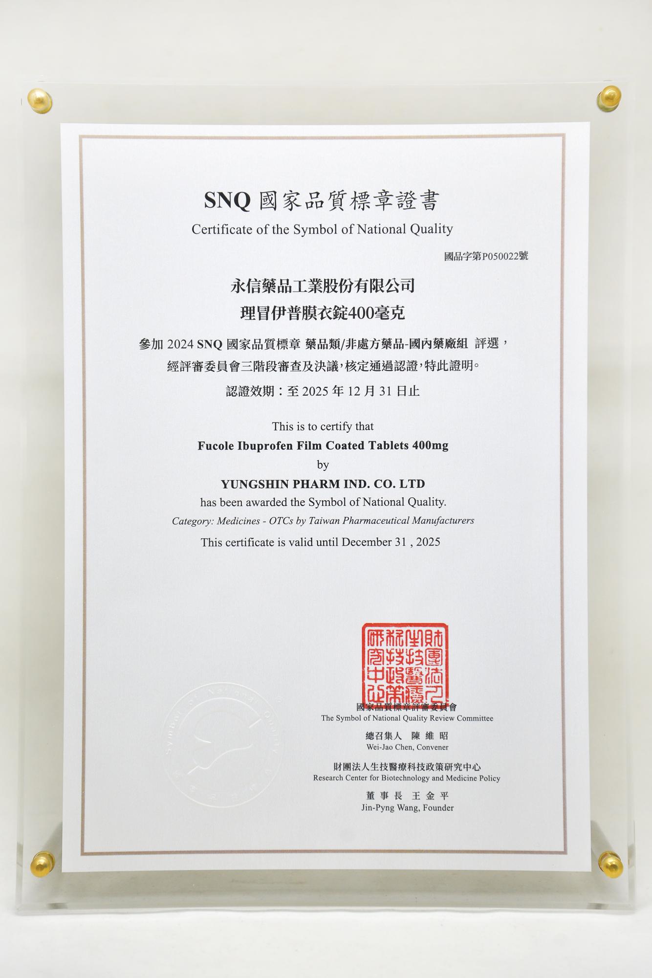 - Yung Shin Convenience Medicine for home use, Ibuprofen Capsules, won the SNQ National Quality Seal Award for 17 consecutive years.