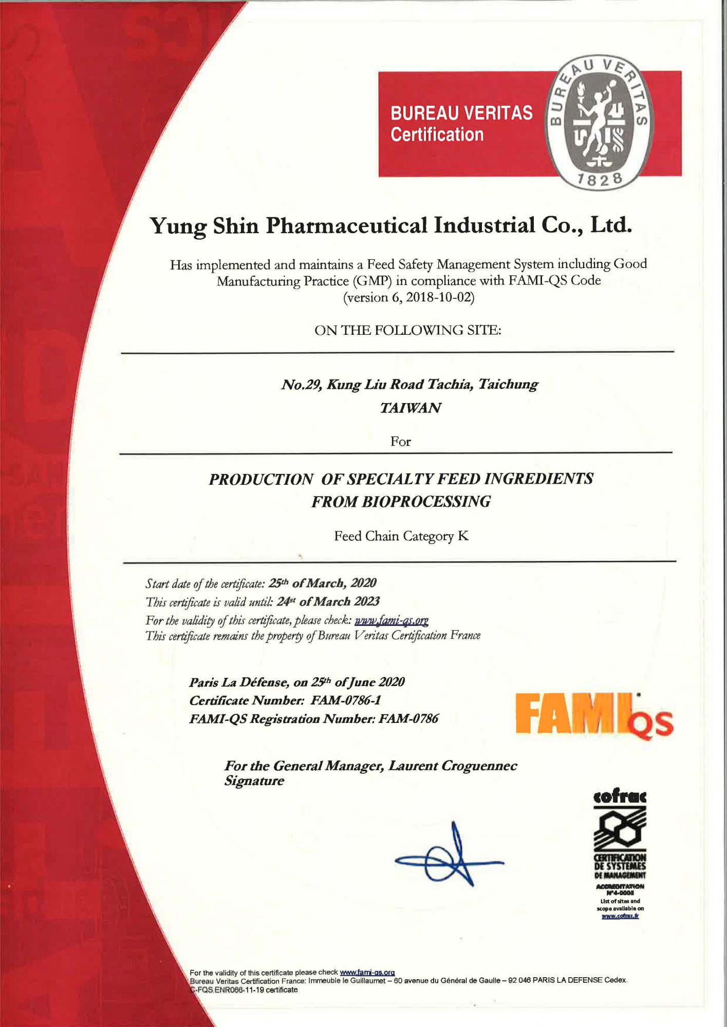 - Taichung Dajia Youth Industiral Park Plant 2 was awarded the first animal enzyme factory in Taiwan to pass the new FAMI-QS [Version 6.0] certification.