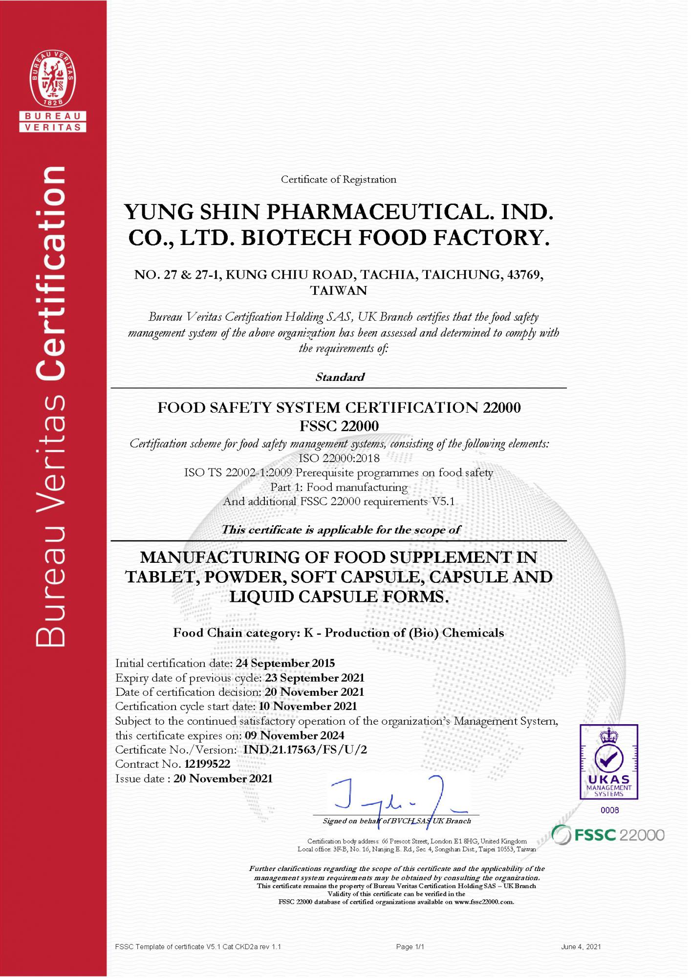 - Biotech manufactuing plant for dietary supplements passed FSSC22000 v5.1 certification
