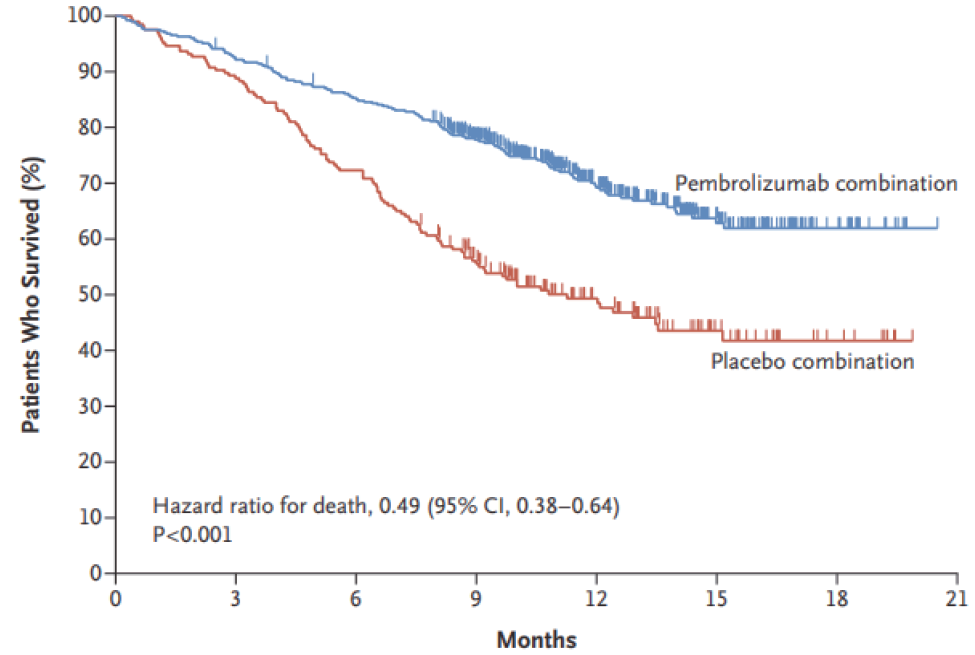 圖 1A 顯示了pembrolizumab 治療組與安慰劑治療組在治療族群中,總體存活率的Kaplan–Meier 估計值,並證明pembrolizumab 治療組的總體存活率顯著更長,死亡風險更低。